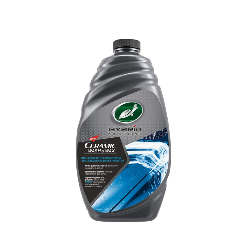 Turtle Wax Hybrid Solutions Ceramic Wash & Wax (1.42L) simplifies car washing and waxing. This concentrated formula removes dirt and road grime while applying a protective ceramic coat, leaving a brilliant shine in one step. Safe for all paint finishes, it delivers a clean, shiny, and protected car in a time-saving wash.